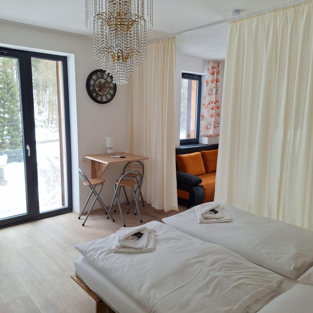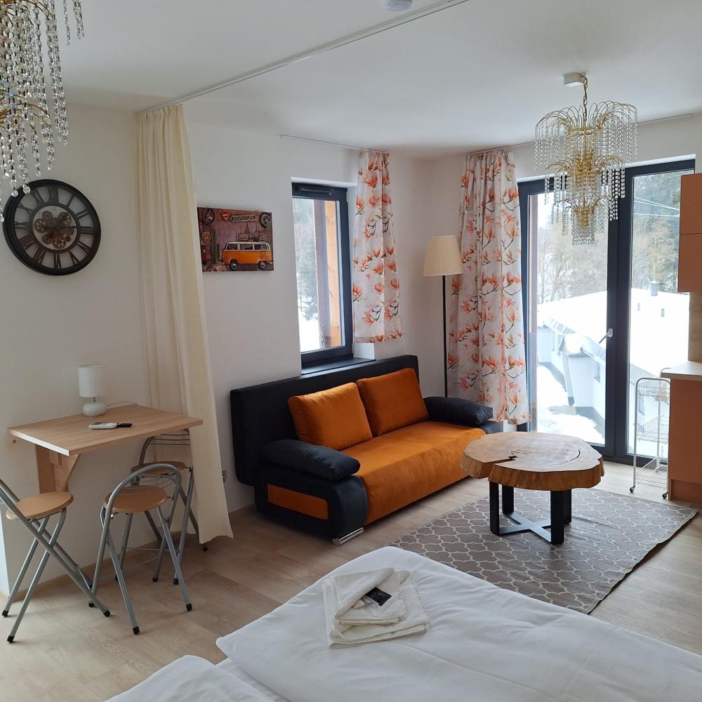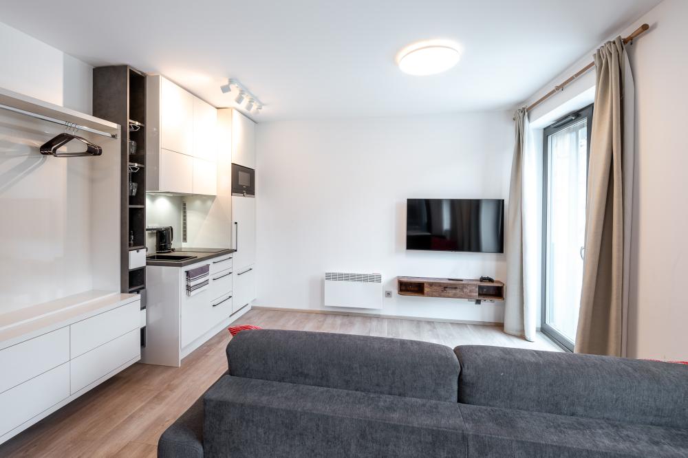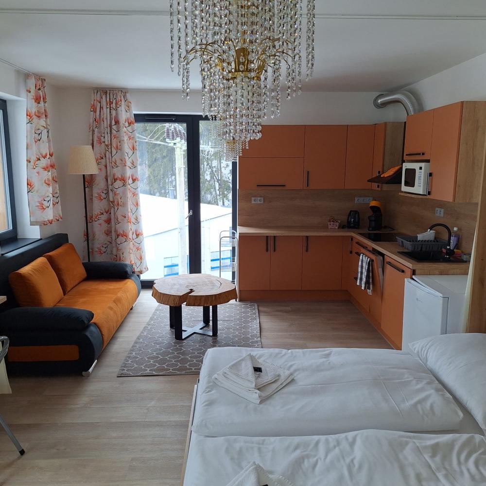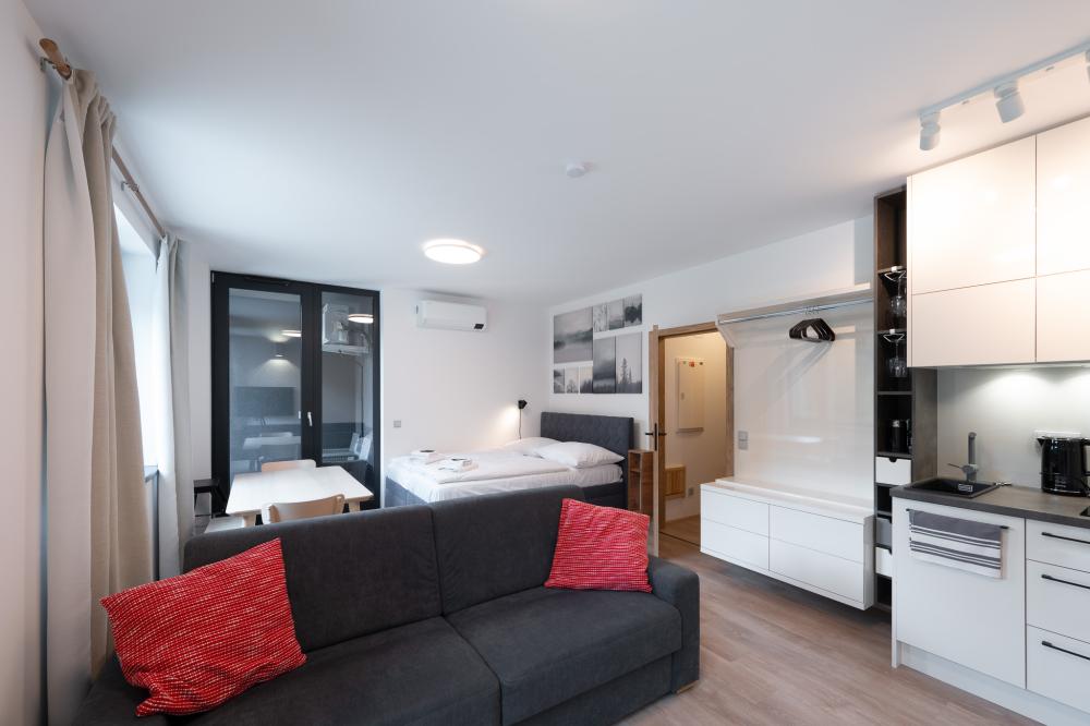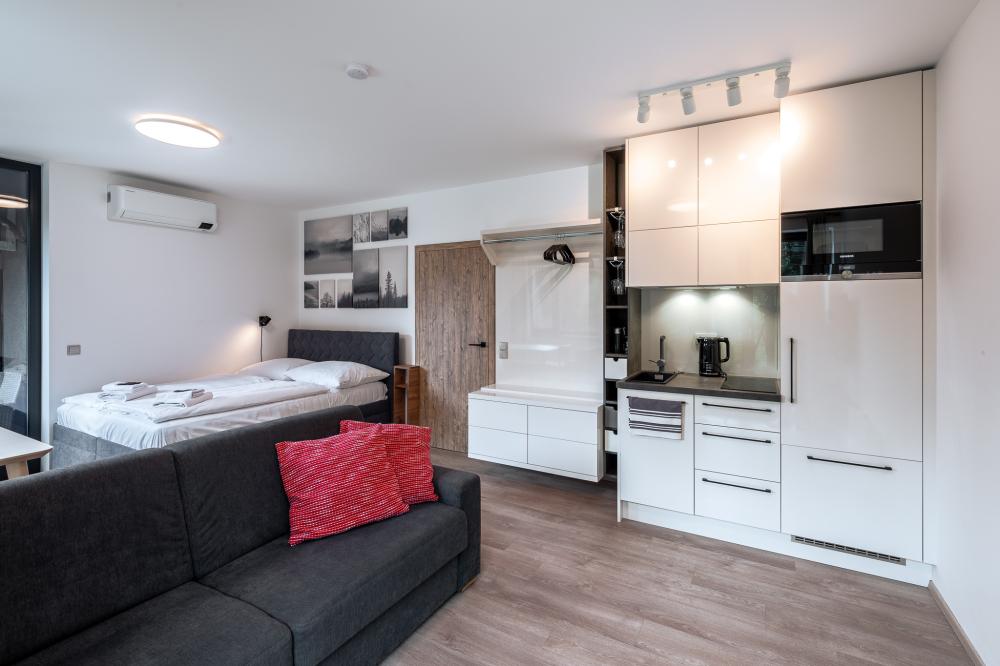 V této kategorii vám nabízíme ubytování v apartmánu 1KK s obytnou plochu 25 m2, ve které je obsaženo všechno vybavení až pro 4 osoby. Spaní na výklopném dvoulůžku a na rozkládací pohovce pro 2 osoby. Vybavená kuchyň specifické barevnosti nabízí vše potřebné (mikrovlnka, trouba, kávovar, myčka, rychlovarná konvice). Na úkor spacímu prostoru není v apartmánu klasický jídelní stůl. V rámci