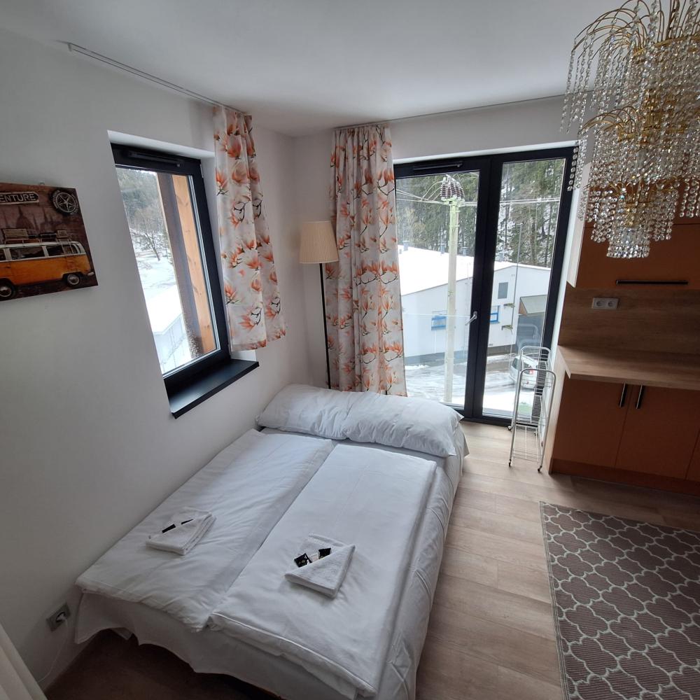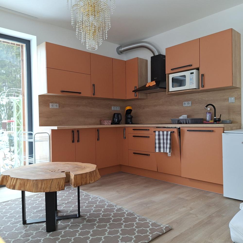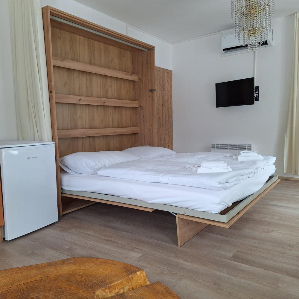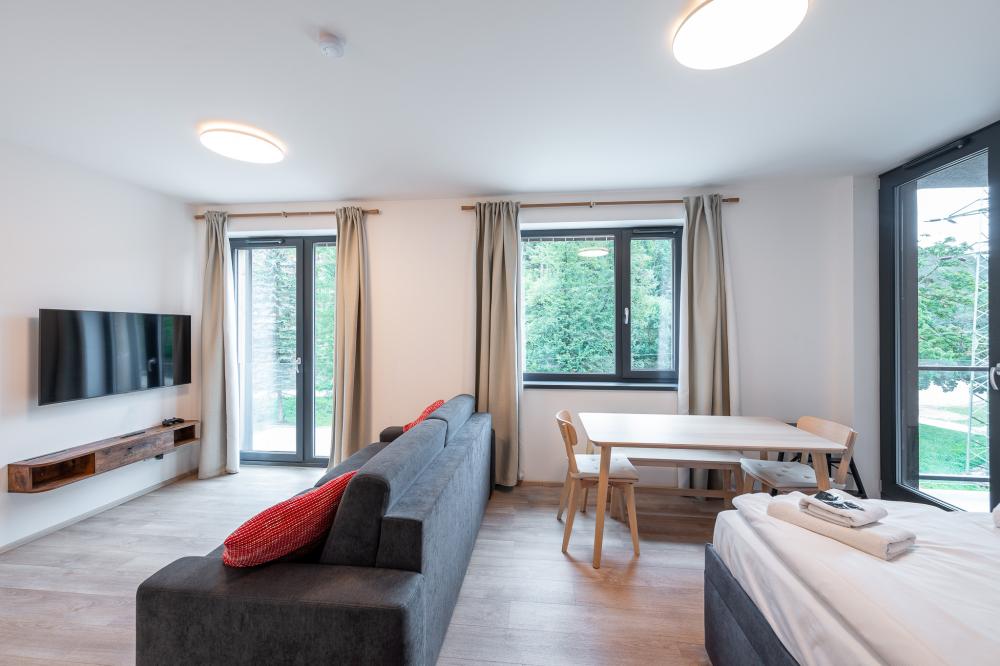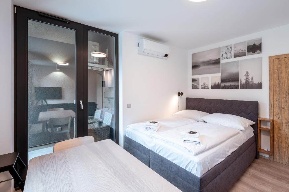 V této kategorii vám nabízíme ubytování v apartmánu 1KK s obytnou plochu 25 m2, ve které je obsaženo všechno vybavení až pro 4 osoby. Spaní na výklopném dvoulůžku a na rozkládací pohovce pro 2 osoby. Vybavená kuchyň specifické barevnosti nabízí vše potřebné (mikrovlnka, trouba, kávovar, myčka, rychlovarná konvice). Na úkor spacímu prostoru není v apartmánu klasický jídelní stůl. V rámci