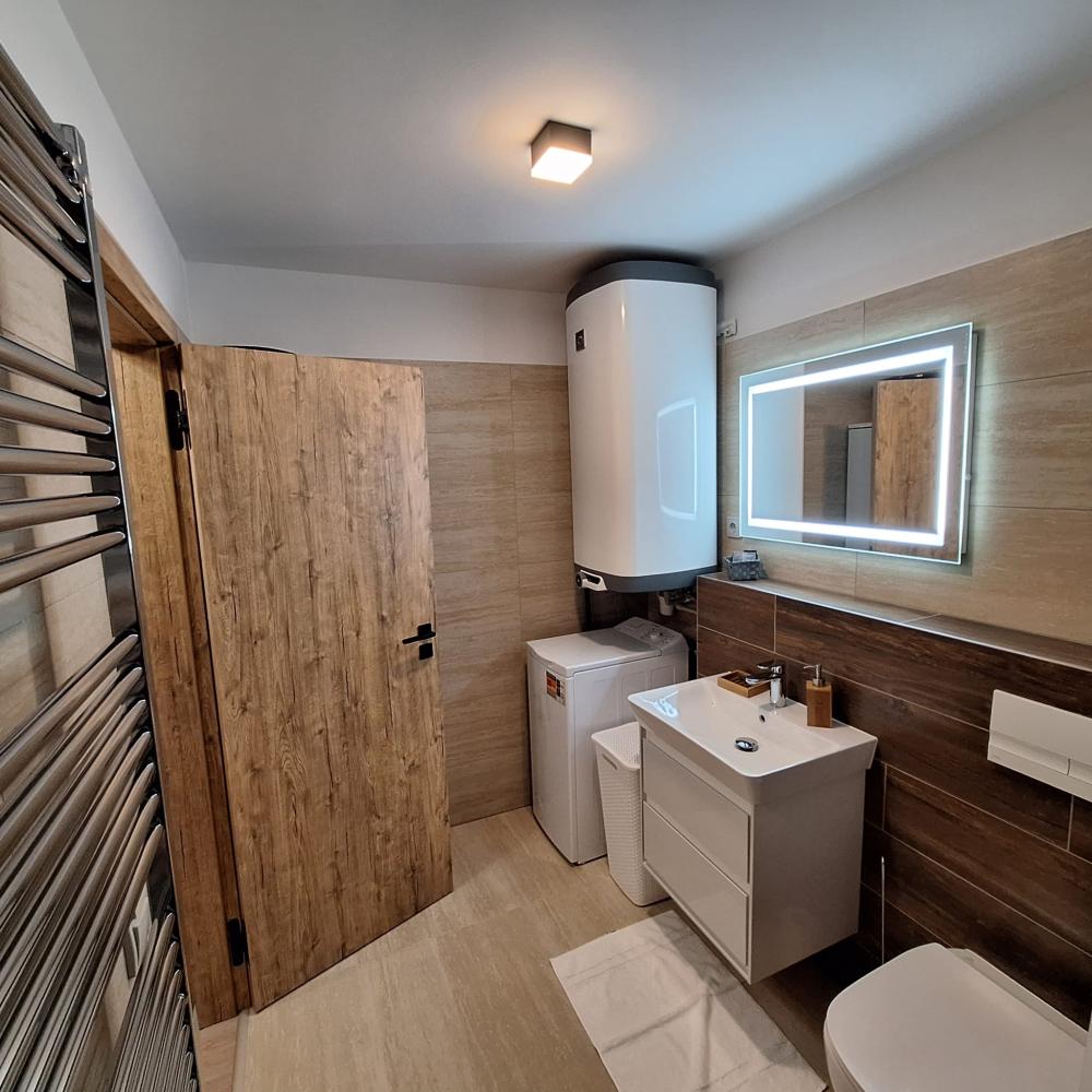 Apartmán 3kk o velikosti 83 m2 se třemi místnostmi, které slouží jako obývací pokoj a dvě ložnice. Výhodou tohoto apartmánu jsou 2 toalety (WC) a pračka se sušičkou. V obývacím pokoji naleznete rozkládací pohovku pro 2 osoby a ve 2 ložnicích kvalitní manželské postele. Jedna ložnice je doplněna o samostatné rozkládací lůžko. Apartmán disponuje kuchyňským koutem s kávovarem na zrnkovou