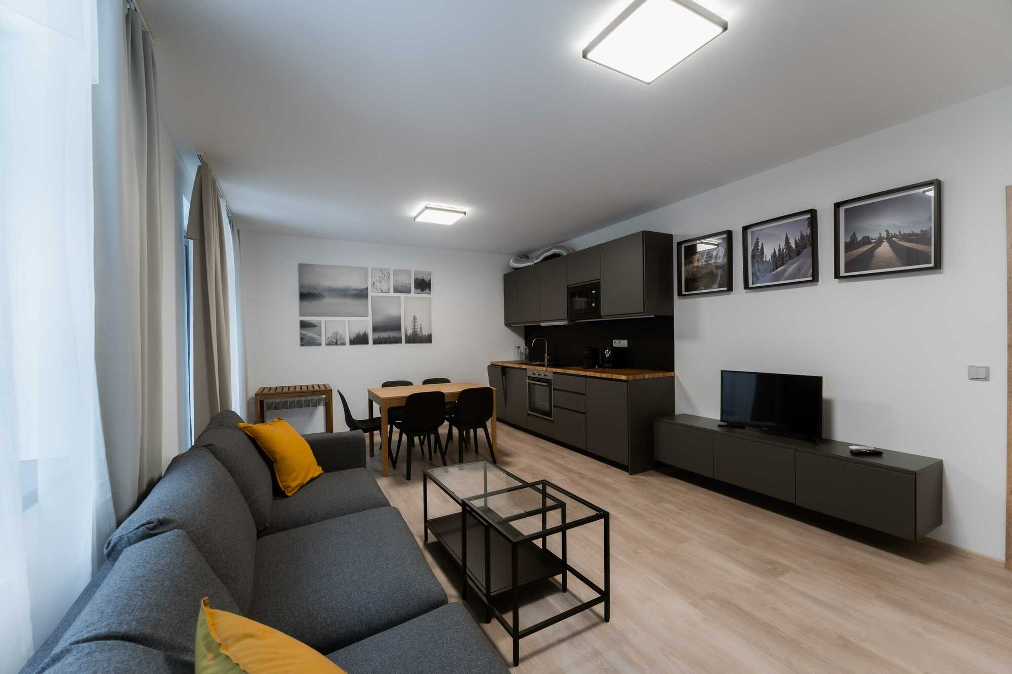 Apartmán 2kk o velikosti 59 až 65 m2 s dvěma místnostmi, které slouží jako obývací pokoj a ložnice. V pokoji naleznete rozkládací pohovku a v ložnici manželskou postel. Apartmán disponuje koupelnou s WC a kuchyňským koutem.