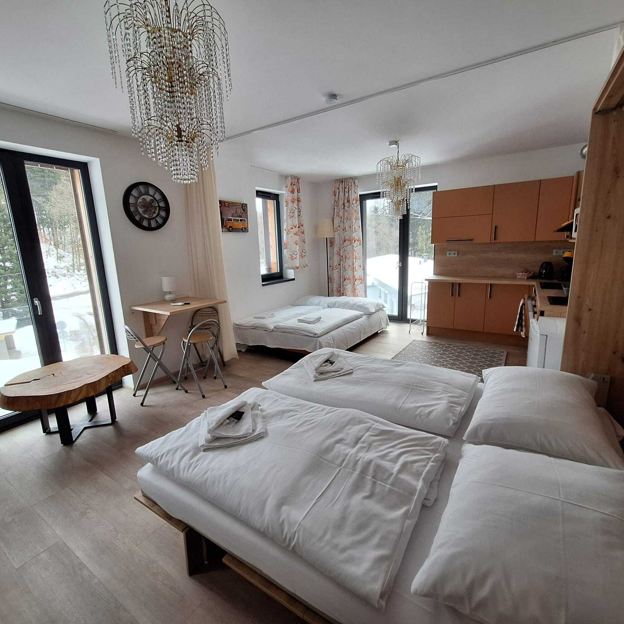 V této kategorii vám nabízíme ubytování v apartmánu 1KK s obytnou plochu 25 m2, ve které je obsaženo všechno vybavení až pro 4 osoby. Spaní na výklopném dvoulůžku a na rozkládací pohovce pro 2 osoby. Vybavená kuchyň specifické barevnosti nabízí vše potřebné (mikrovlnka, trouba, kávovar, myčka, rychlovarná konvice). Na úkor spacímu prostoru není v apartmánu klasický jídelní stůl. V rámci kuchyňské linky jsou k dispozici jídelní místa formou barového pultu. K pohovce náleží konferenční stolek, pro případné večerní posezení. Na malé lodžii je sezení pro 2 osoby. Byt je orientován jihovýchodně.