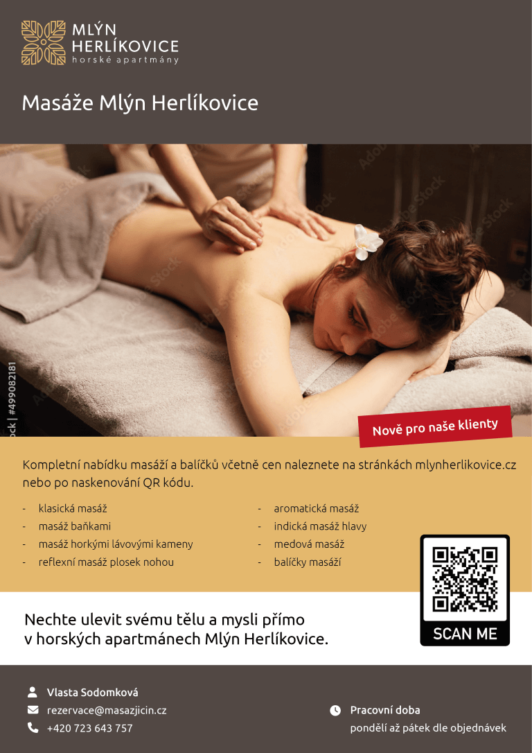 Zároveň nabízíme možnost využít služby masérny se širokou nabídkou služeb. Možná zrovna potřebujete uvolnit bolavá záda. Podívejte se na nabídku níže.